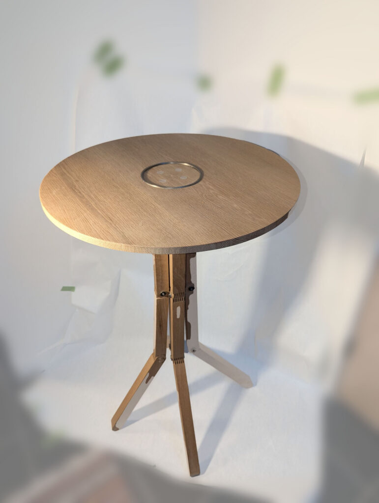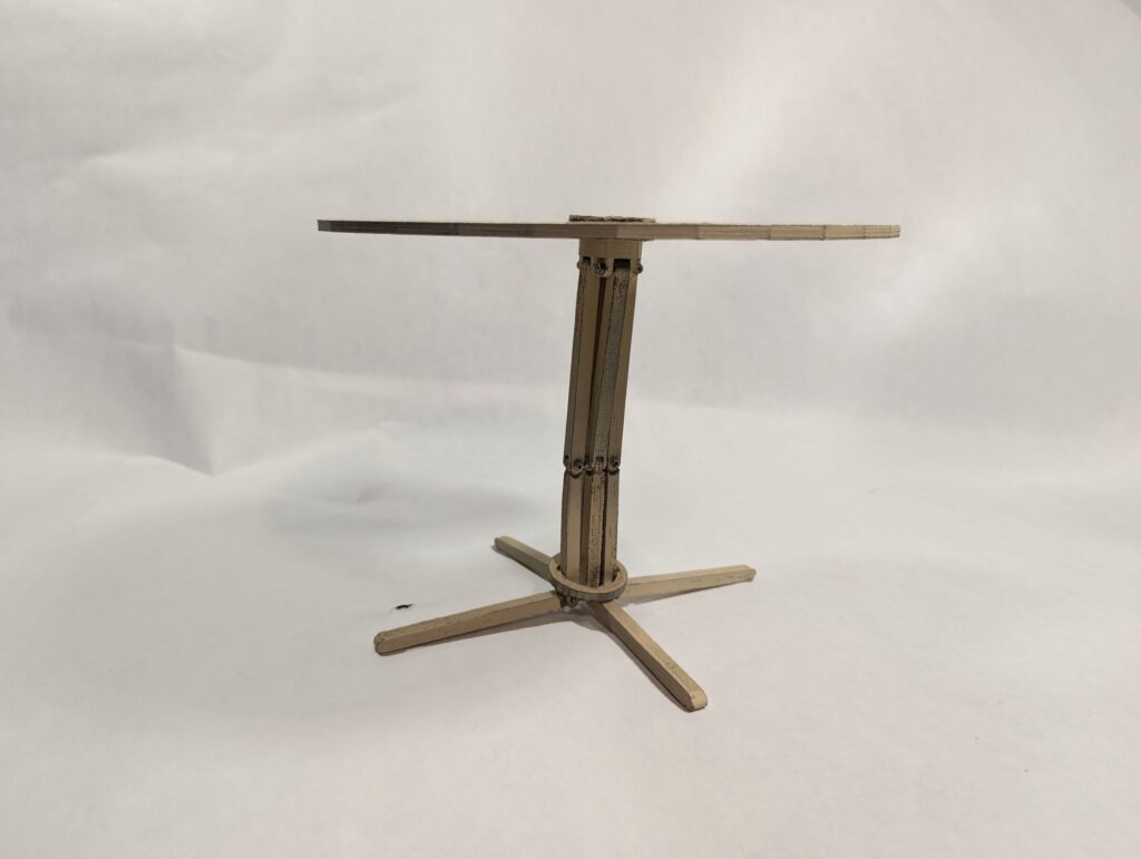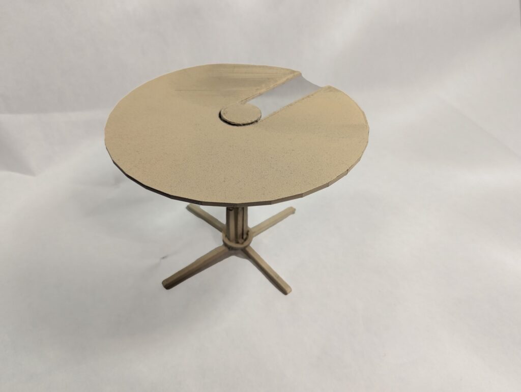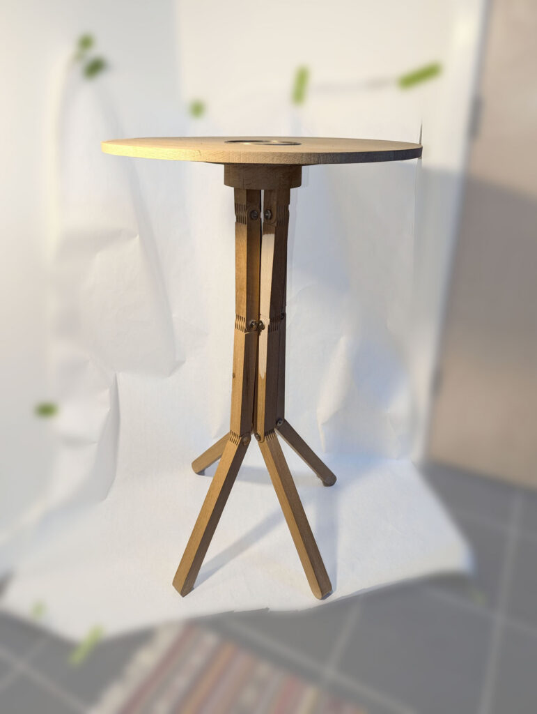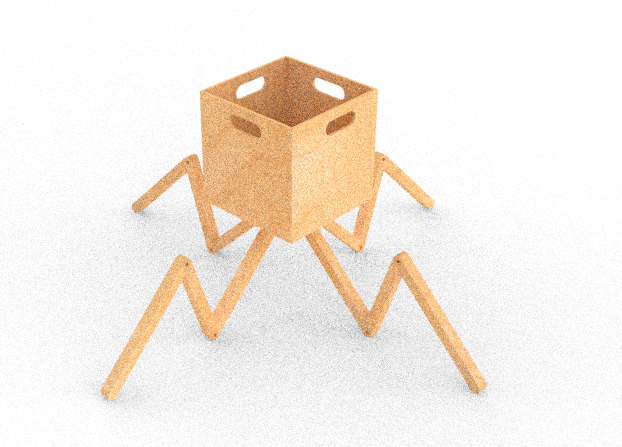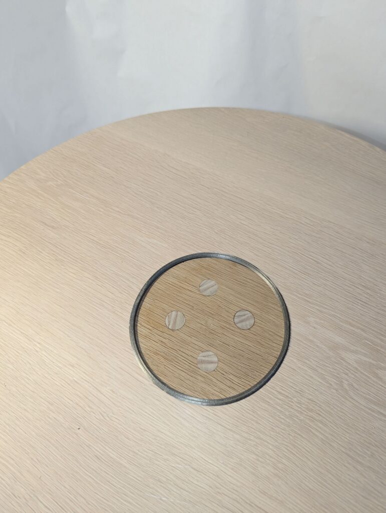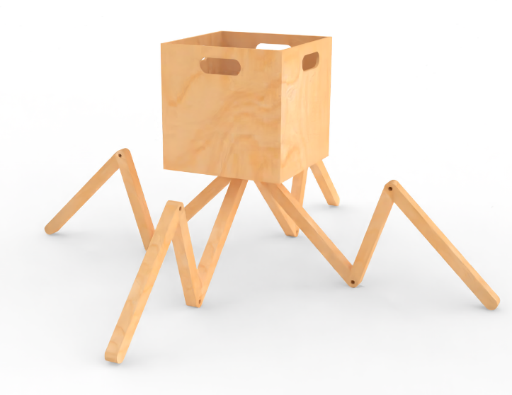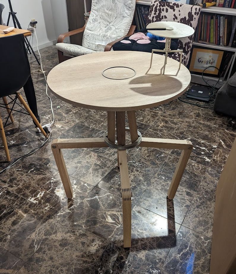 As I was designing the 3D model (see it on Sketchfab), I ended up on a central ‘hub’ system for swapping different components onto the legs. The hub would rely on a compression ring (and a mallet) as attachment mechanism. For production, I decided that the default attachment would be a table top — the crate was cool but a table offered greater functionality, better aesthetics and improved recognizability (sic).
