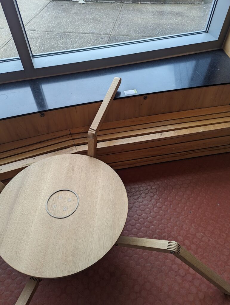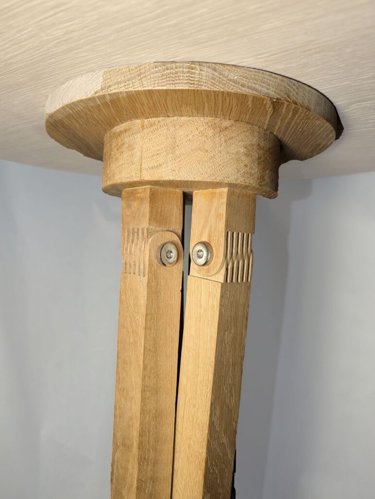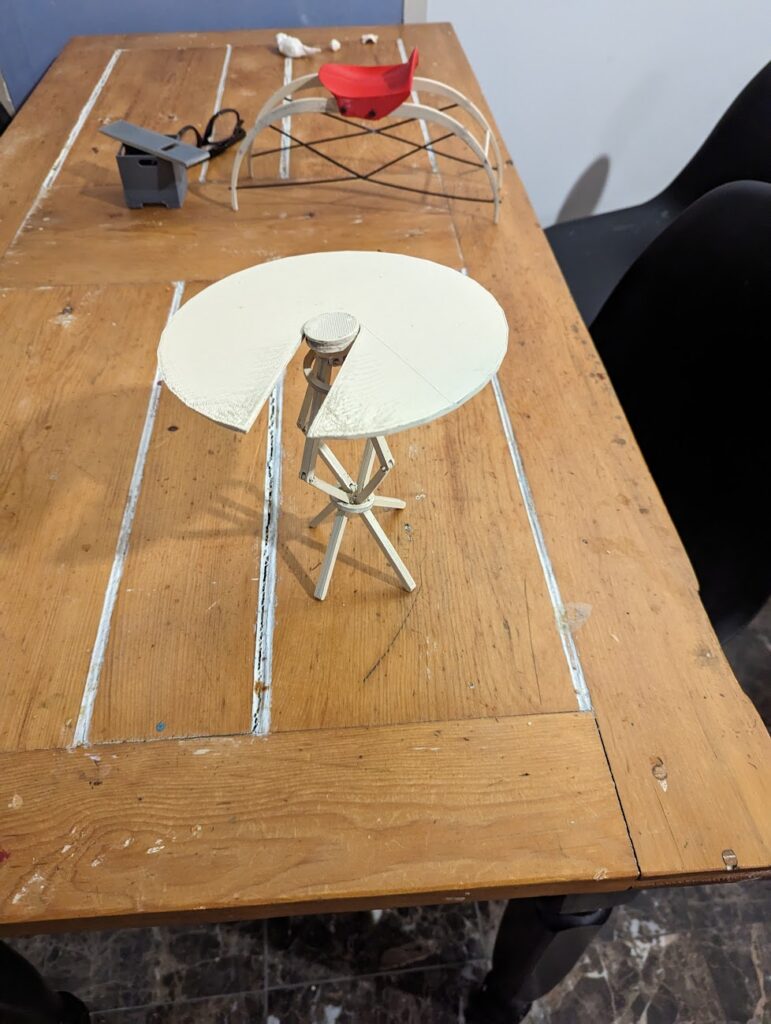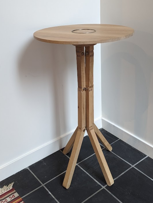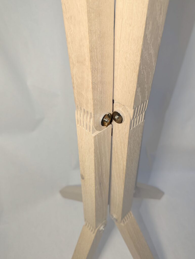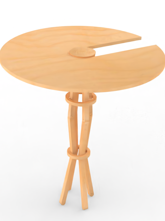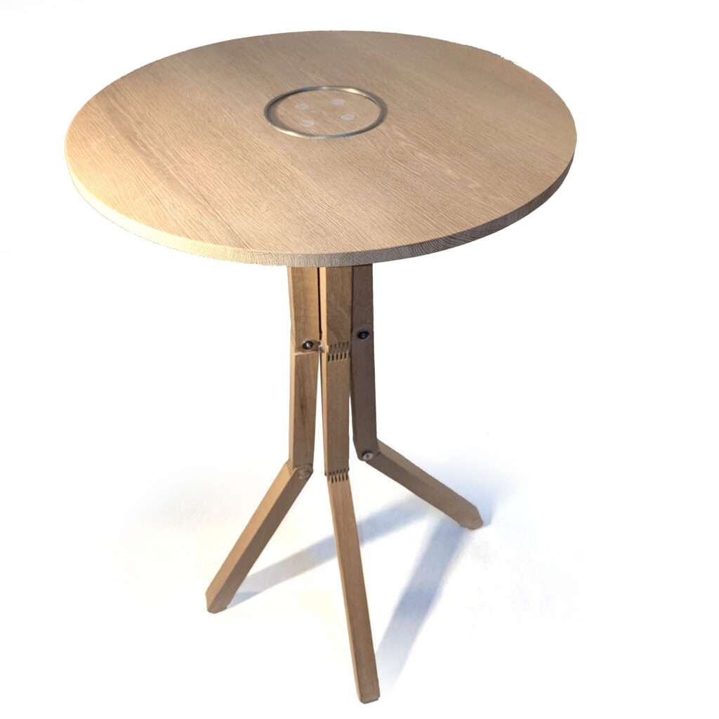As I was designing the 3D model (see it on Sketchfab), I ended up on a central ‘hub’ system for swapping different components onto the legs. The hub would rely on a compression ring (and a mallet) as attachment mechanism. For production, I decided that the default attachment would be a table top — the crate was cool but a table offered greater functionality, better aesthetics and improved recognizability (sic).