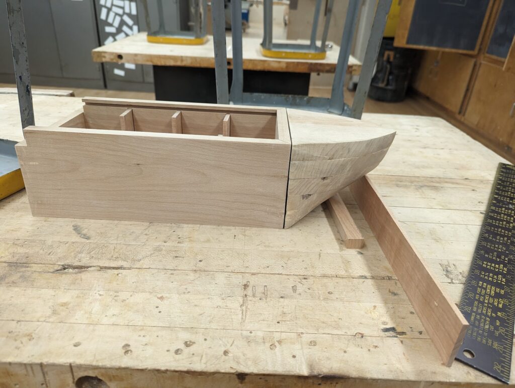 For the sculpture project, some students glued together wood to alter the shape of the sculpture beyond the raw form. Making a hollow hull would have been a tremendous undertaking, so I decided to just make it out of a big chunk of wood. I could have glued all of the blocks together and busted out the chisel again to form the hull. This would have been a huge undertaking and could have ended up lopsided etc.