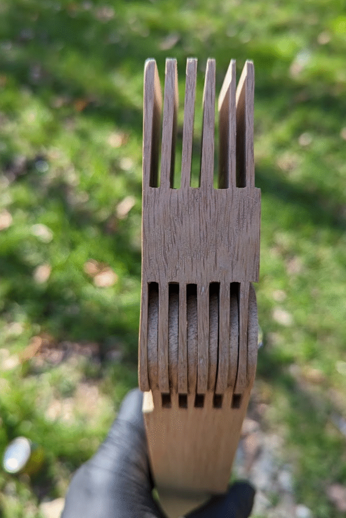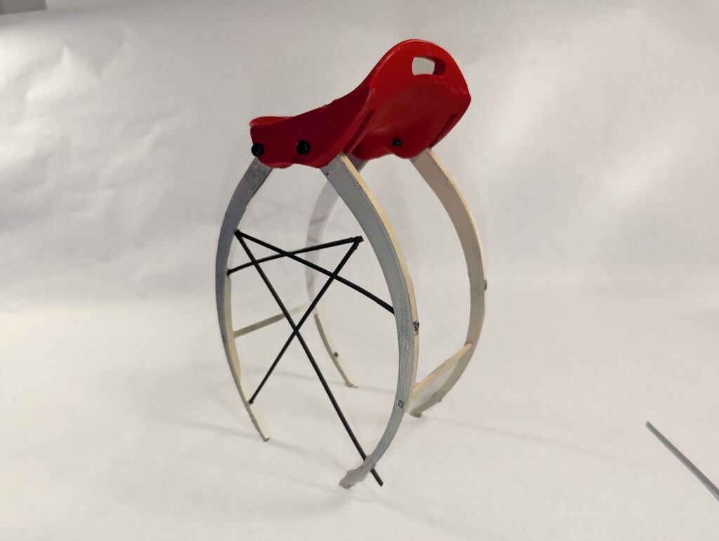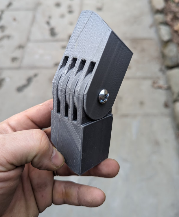 My initial design used a “knuckle” for the joints in the legs. Jeff and Ed said that it would be wobbly and ineffective and suggested that I use a finger-joint instead. A finger joint requires very specific shim/template to have the proper fitment and count so I mocked this part up in 3D and prototyped in PLA:
