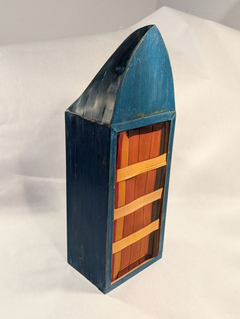 Sticking with the rustic, vernacular theme of the Sailor, I again used milk paint for the finish of the boat… leaving the interior raw unfinished wood (again the coffin motif). The milk paint was protected from oily fingerprints by applying a light coat of finish wax. The final touch on the boat were ‘shiplap’ grooves on the sides — applied with an X-acto knife.