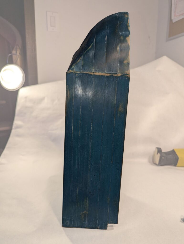 Due to the ‘resolution’ (or height) of the blocks, this led to a stepped rough shape. I used an orbital sander to shape it down into a smooth seaworthy hull.